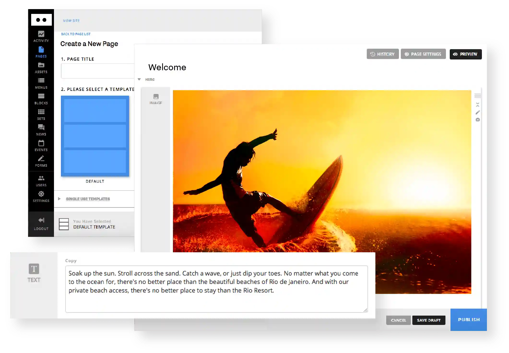 Each website is designed with a set of custom templates and modules driven by the content needs of your users and brand, and include dropzones that correspond to components of a custom design. Blocks added to these dropzones are combined to create the compelling content destined for your user.