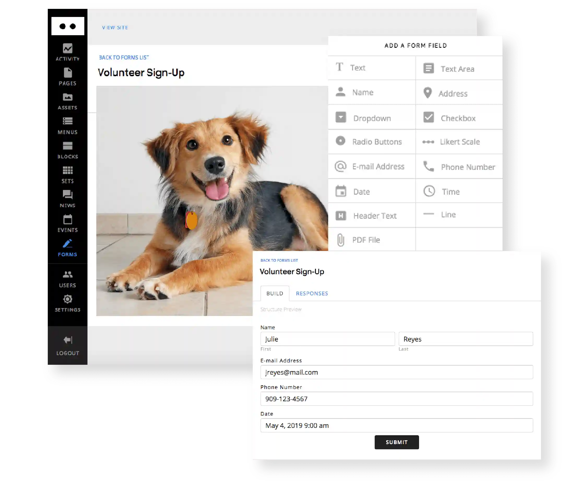 The BlokBlok Forms module gives content managers the ability to easily create easy-to-use web forms. The Forms builder features a drag-and-drop interface with commonly used fields and can be customized to meet your unique form needs. Forms are then added as blocks where needed. Form responses are stored in the CMS where they can be exported and also sent via email to the appropriate person. The Forms module can be integrated with CRM platforms, such as Salesforce, SugarCRM, NeonCRM and Act!
